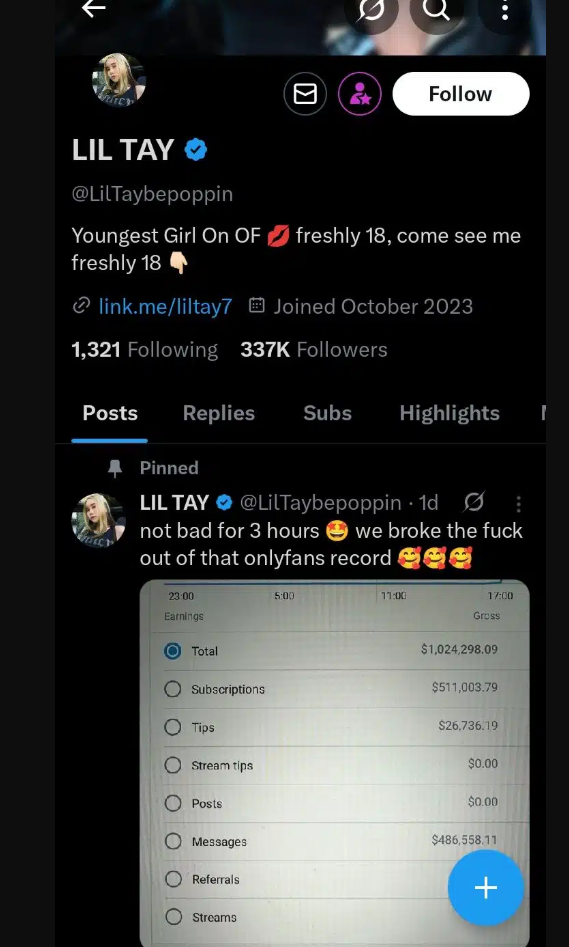 The controversial internet star opened the account on her 18th birthday and later took to X (formerly Twitter) to share a screenshot of her earnings, which showed a total of approximately $1,024,298.09.