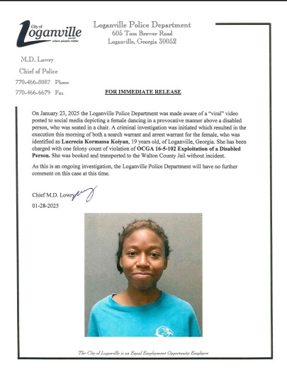 The Loganville Police Department after launching an investigation on the video issued a statement saying; “On January 23, 2025, the Loganville Police Department was made aware of a ‘viral’ video posted to social media depicting a female dancing in a provocative manner above a disabled person”.