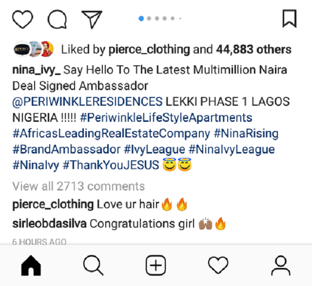 Big Brother Naija 2018 housemate, Nina has secured an endorsement deal with reportedly worth millions of naira with a real estate company in Lagos.