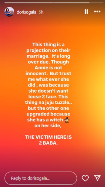 Doris also mentioned that Annie might be influenced by “juju” and that 2Baba is the true victim in their relationship.