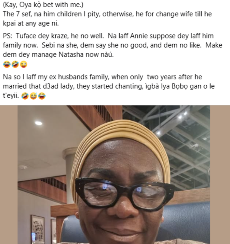 “PS: Tuface dey kraze, he no well. Na laff Annie suppose dey laff him family now. Sebi na she, dem say she no good, and dem no like. Make dem dey manage Natasha now nàú.