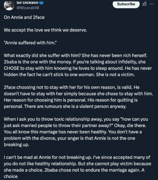 In a post on X (formerly Twitter), he mentioned that Annie should not act like the victim in their divorce, as 2Baba is no longer interested in staying in the marriage.