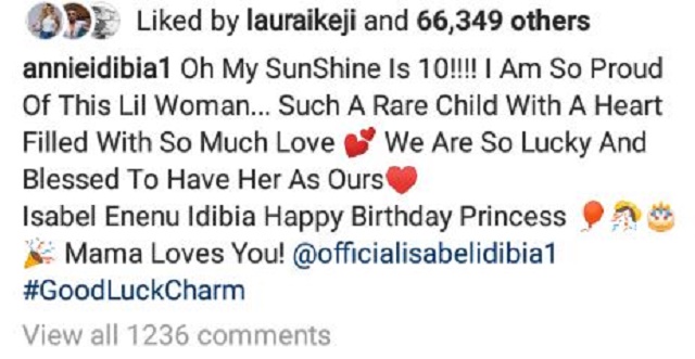 “Oh my sunshine is 10!!!! I am so proud of this little woman. Such a rare child with a heart filled with so much love. We are so lucky and blessed to have her as ours. Isabel Enenu Idibia, Happy birthday princess. Mamy loves you,” Annie Idibia showered encomium on her.