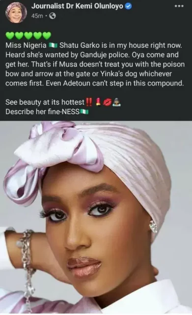 Investigative journalist Kemi Olunloyo, has taken to social media to gloat about inviting 2021 Miss Nigeria, Shatu Garko to her house recently after Hisbah police claimed that Shatu’s participation in the beauty pageant is forbidden in Islam.