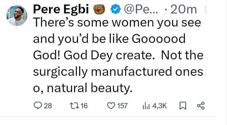 Pere tweeted that women with natural beauty are more appreciated, while those who have surgery are seen differently.