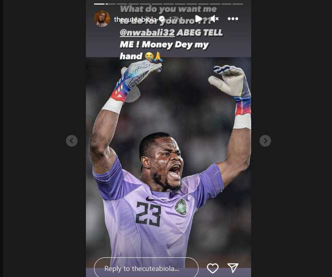 Cute Abiola came to social media to promise the custodian something after being extremely happy with Nwabali’s performance. The comedic actor claims he has money to spend.