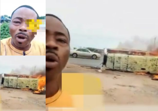 In the video the actor kept appreciating God for sparing his life as he captured the scene showing how the vehicle continued to burn despite intervention by firemen.