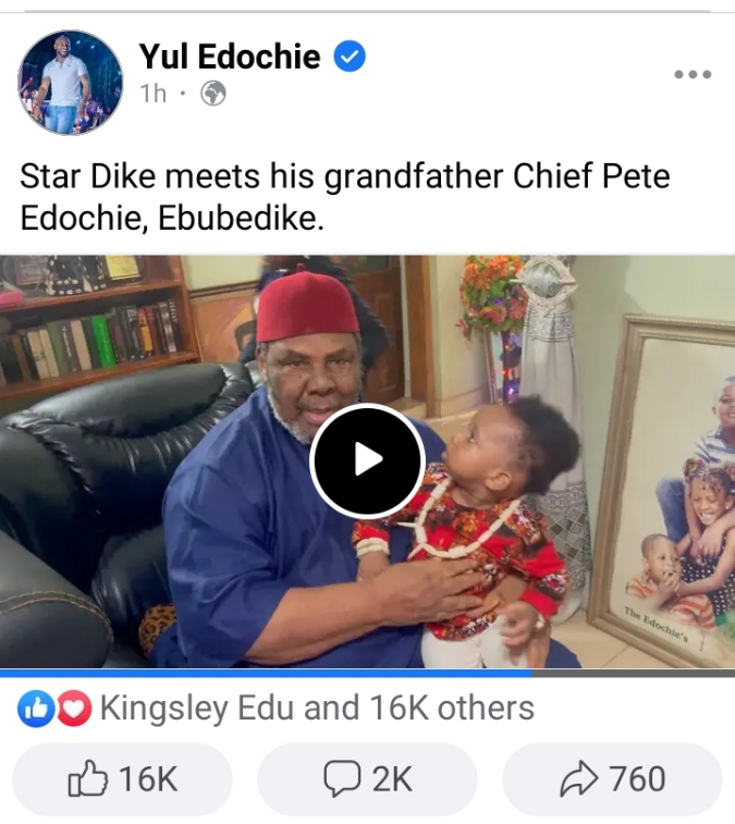 In the video, a very cute grandfather-child moment was captured as Pete Edochie held his grandson. Yul was also heard at the background communicating with his dad.