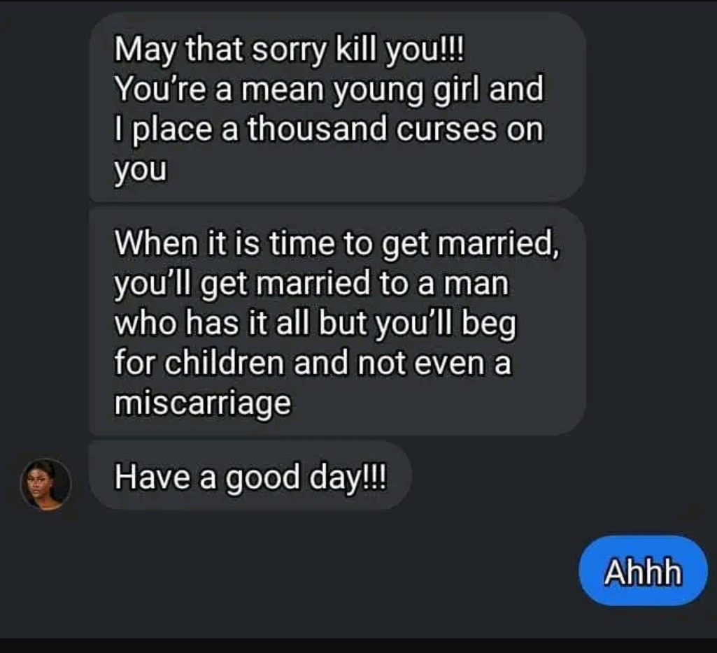 “I’m not barren. I actually had miscarriage and I’ve been battling with the pain of loosing a child. But as you found it fun to mock me, in your time of life, you shall be called barren”, She stated.