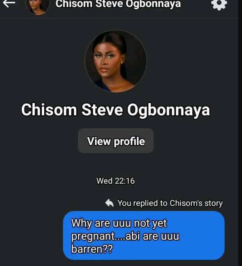 In a recent Facebook post, Chisom shared a screenshot of a direct message from a woman who bluntly asked, “Why are you not yet pregnant? Abi are you barren?”