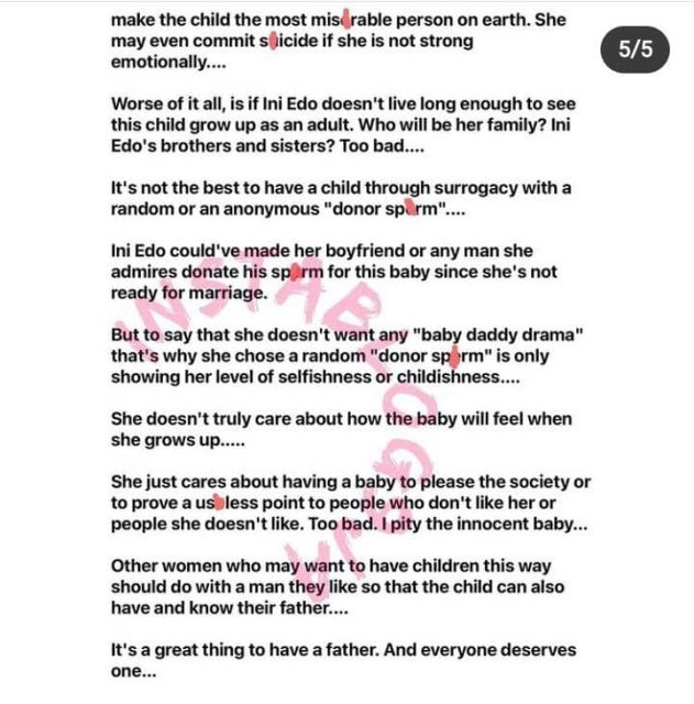 Ini’s eggs were fertilized by a sperm donor but the writer feels Ini has made a big mistake taking that route.
