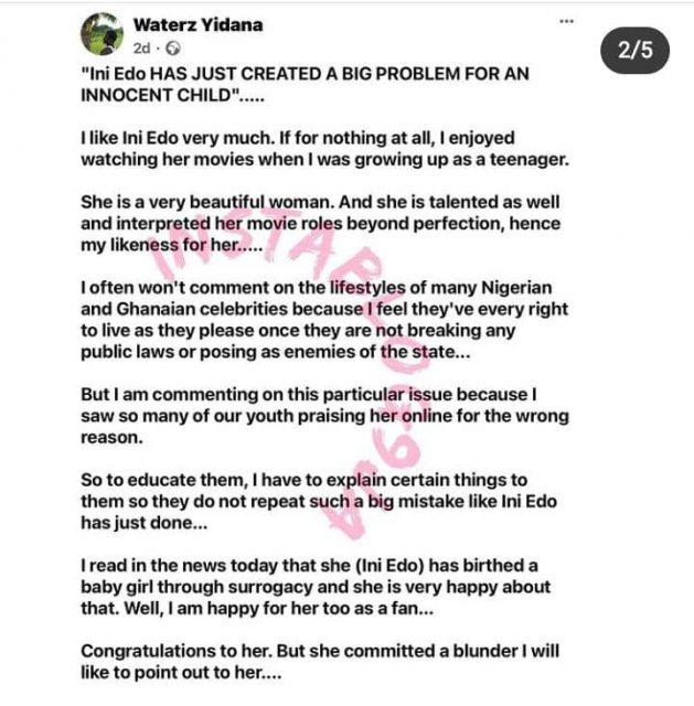 Nigerian Actress, Ini Edo has been chided by a Nigerian writer for her choice of having her child through surrogacy.