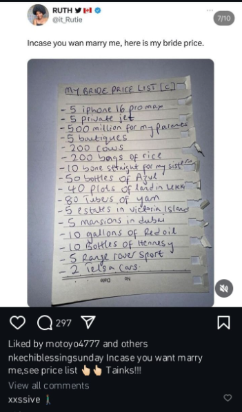 Among her requirements are five iPhone 16 Promax devices, five private jets, 500 million naira for her parents, five boutiques, 200 cows, 200 bags of rice, ten bone straight wigs for her sisters, 40 plots of land in Lekki, 80 tubers of yam, five mansions in Dubai, five Range Rover Sports, two Tesla cars, and additional items as part of her bride price.