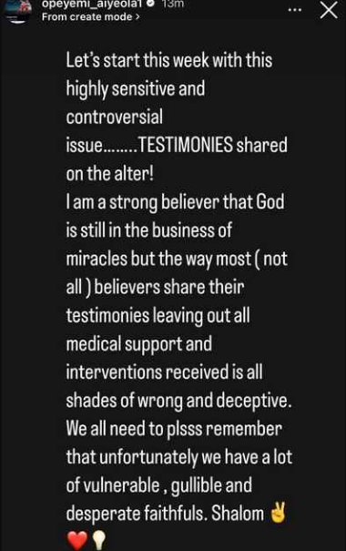 - Opeyemi Aiyeola has shared her thoughts on the importance of including medical help in church testimonies.
