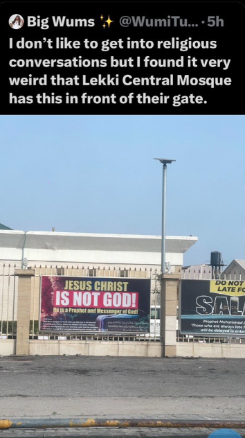 “I don’t like to get into religious conversations, but I found it very weird that Lekki Central Mosque has this in front of their gate.” she wrote.