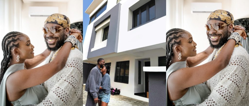 The couple, dressed in relaxed outfits and radiant with joy, stood before a sleek and modern home that hinted at a major achievement.