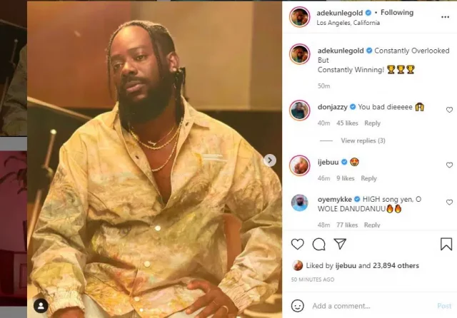 Adekunle Gold took to his Instagram page to share photos of himself, stating that he is constantly overlooked notwithstanding, he is continuously winning.