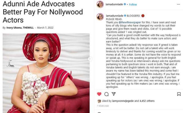 Actress, Adunni Ade has tendered an apology for her statement on Yoruba filmmakers and actors who are not well paid.