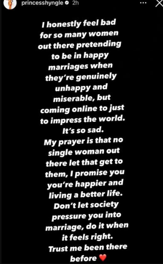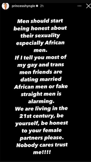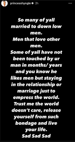 In an Instagram post, Princess expressed her concern that many African married women experience unhappiness due to being wed to men who are more interested in men than in women.