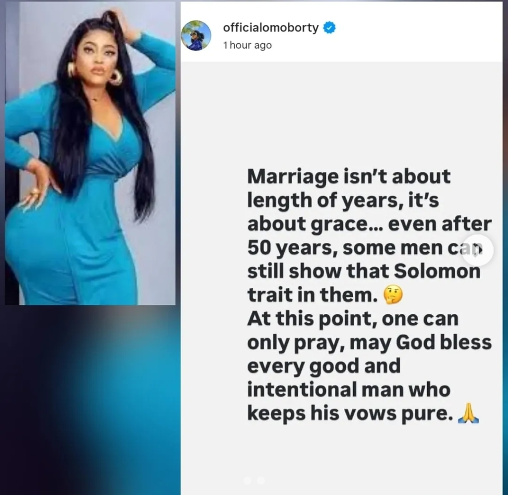 The actress posted a text image that read in part: “Marriage isn’t about length or years, it’s about grace… even after 50 years, some men can still show that Solomon trait in them. At this point, one can only pray, may God bless every good and intentional man who keeps his vows pure.”