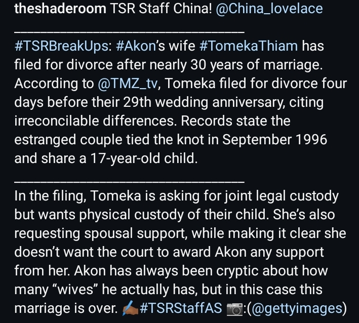 Tomeka is seeking joint legal and physical custody of their 17-year-old child. She is also requesting spousal support while preventing Akon from receiving any support from her.