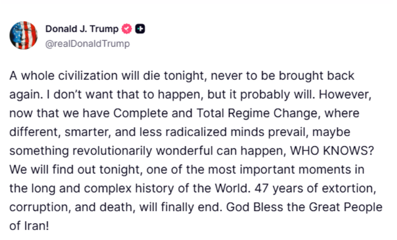 In a strongly worded message, the former United States president declared: “a whole civilisation will die tonight,” expressing concern while also hinting that such an outcome might be unavoidable.