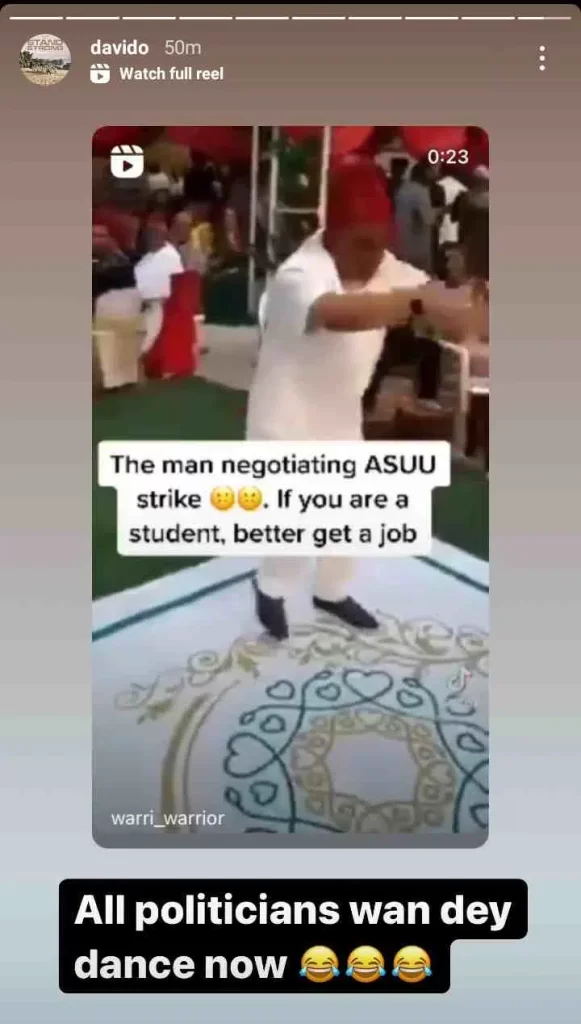 A caption in the video stated that Nigerian students should better get a job for themselves because the person in charge for negotiations with the Academic Staff Union of Universities (ASUU) who are currently on strike is actually dancing.