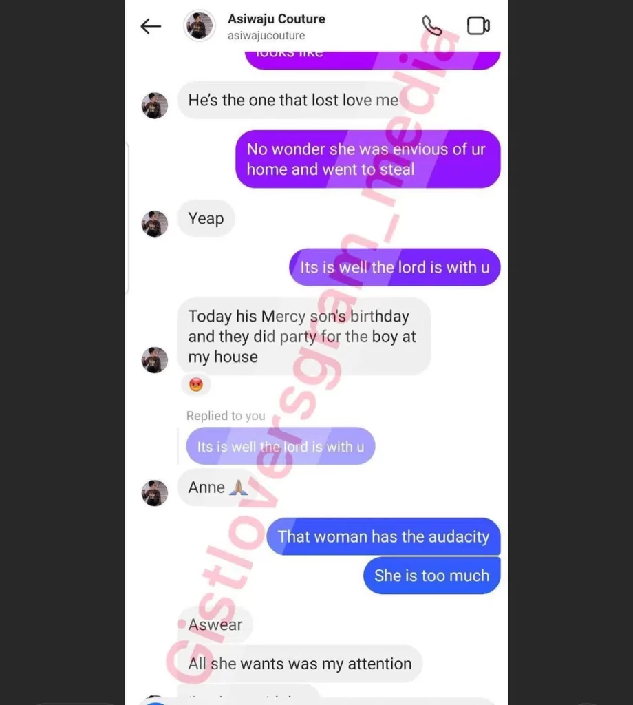 GISTLOVER wrote on Instagram: Hello tueh tueh , Otun ti zeh oooo, GLB Nation, be like that day wey mercy come enter dm tell us say she no go disturb the first wife again , be like Na chair wey nor get leg she put us on ooo, this chat uploaded is between Asiwaju and one of her friend , the first wife( Asiwaju couture ) talk say mercy still Dey do the pepper them ooo, say but now Na low key say she Dey run from Vawulence Nation make them no drag am like I pass my neigbour Nisan generator t was revealed in the chat say mercy carry her pikin,niwon come the house wey Asiwaju and him wife build , say Na the house them mark the boy birthday say she come begin post am for WhatsApp Dey pepper them, say she no gree post am for instagram make another bottle for no hit am unexpectedly this drama ever going to end ???? This is why I advise people , stay your lane , leave people husband , because this wahala Na for life ooooo Ehi wey Dey fo jagaban sef don go beg Cynthia for back lowkey 😂😂when that one don drag am go court for US and them declare Ehi wanted as she no show up for court , them don go settle am lowkey because how you go Dey go court ontop prick wey you don leave ,Duro no Dey reign again for Ehi side Na just management them Dey use Duro do now, if you see them post picture together Na damage control because Aunty Ehi don catch another fish , Na every 3market days that one Dey fall in love back to mercy ore Larrit matter