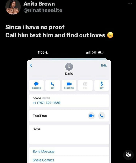 Anita Brown took to Twitter to provide a screenshot of the singer’s phone number, urging his fans to call him and find out the truth.
