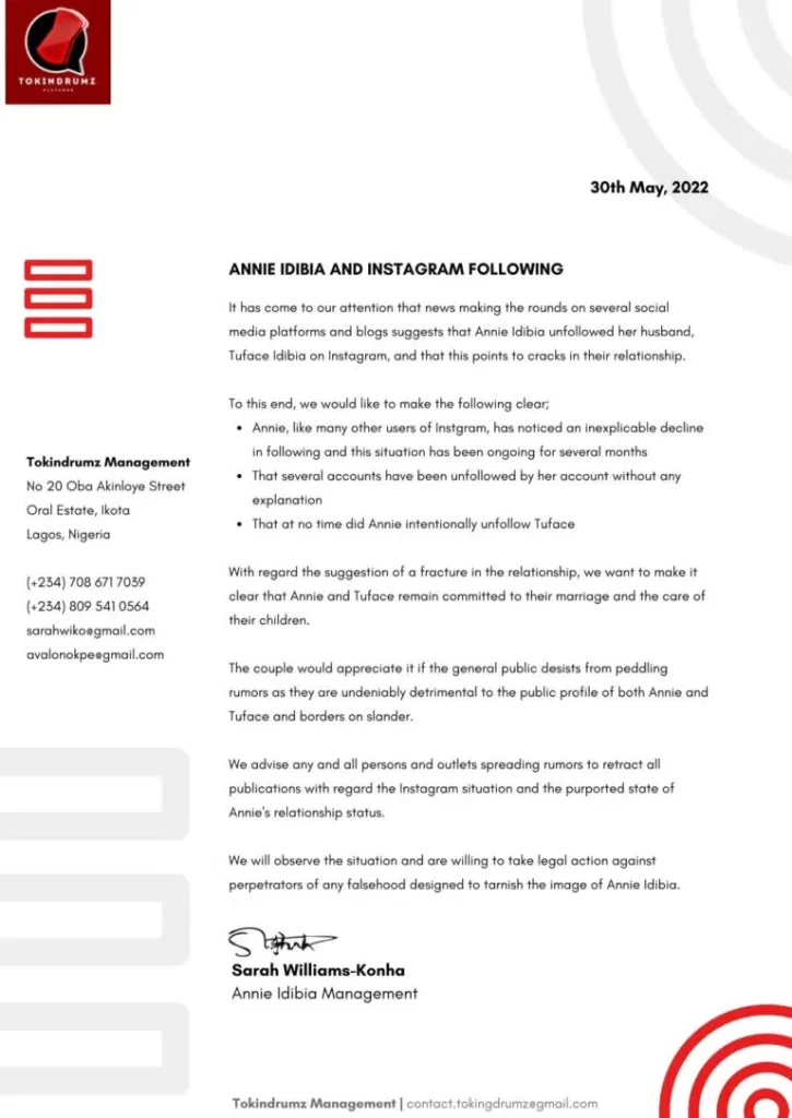 The management of the Nollywood actress Annie Idibia has responded to reports that the actress has unfollowed her husband on social media.