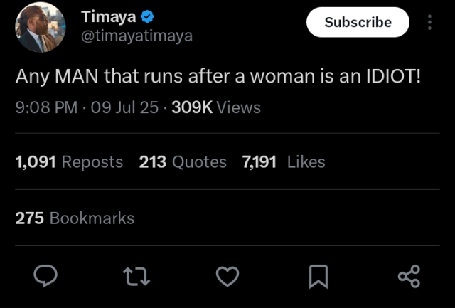 Nigerian music star Timaya has set social media abuzz after making a controversial remark about men who actively pursue women. The singer, known for his outspoken nature, took to his official X (formerly Twitter) account to express his opinion, writing: