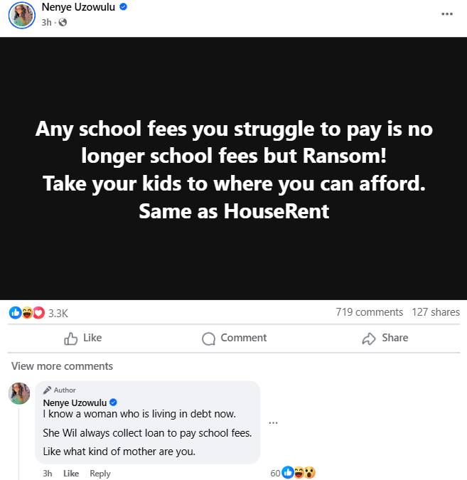 Nigerian Facebook user Nenye Uzowulu has called on parents to think carefully about where they enroll their children, warning that some tuition charges now feel more like “ransom” than school fees.
