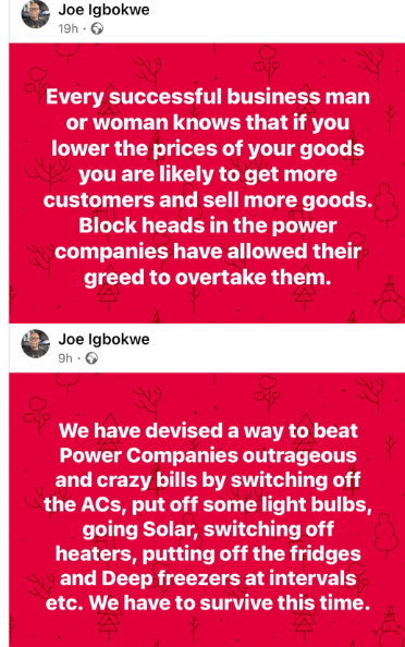 popular APC chieftain, Joe Igbokwe, continues to complain about the present high power tariffs.