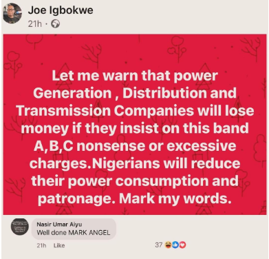 • Igbokwe, a staunch APC supporter, also shared on his Facebook page that if electricity-providing companies continue with their high tariffs, Nigerians would be forced to bypass them.