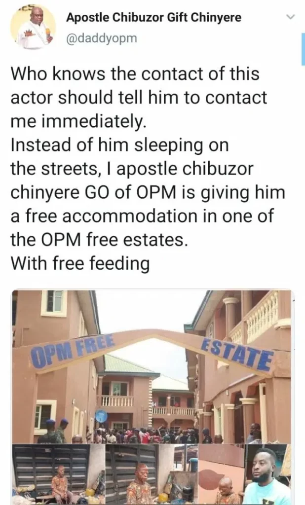 Following pictures of Aguba’s condition, Apostle Chibuzor reacted via his verified Twitter page, offering to accommodate and feed the embattled actor.