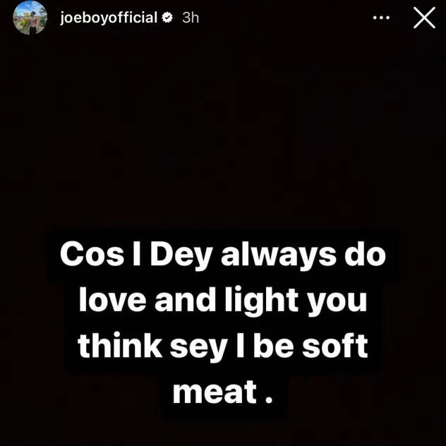 Joeboy took to his Instagram story and reacted to the notice, saying that they were trying to ride on him because of his nice personality.