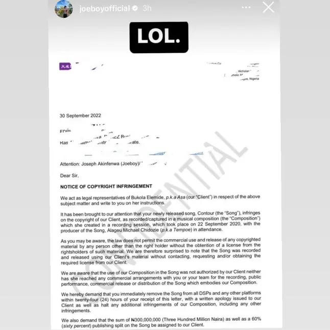 The female singer, in a letter she wrote to Joeboy through her management, demanded the sum of N300 million and a 60% (sixty percent) publishing split on the song.