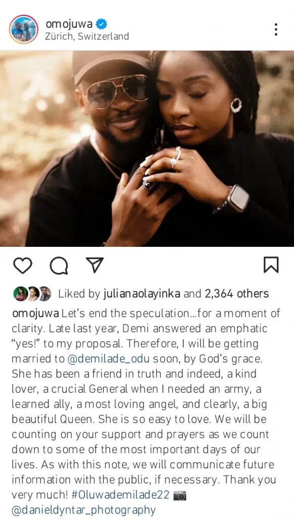 He wrote, “Let’s end the speculation…for a moment of clarity. Late last year, Dami answered an emphatic “yes”! to my proposal. Therefore, I will be getting married to @demilade_osu soon by God’s grace. She has been a friend in truth and indeed, a kind lover, a crucial General when I needed an army, a learned ally, a mist loving angel and clearly, a big beautiful Queen. She is so easy to love. We will be counting on your support and prayers as we count down to some of the most important days of our lives. As with this note, we will communicate future information with the public, if necessary”.