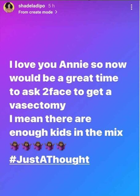 Shade Ladipo started off her post by declaring her love for Annie Idibia and then stating that now would be a great time for her to ask her husband to get a vasectomy.