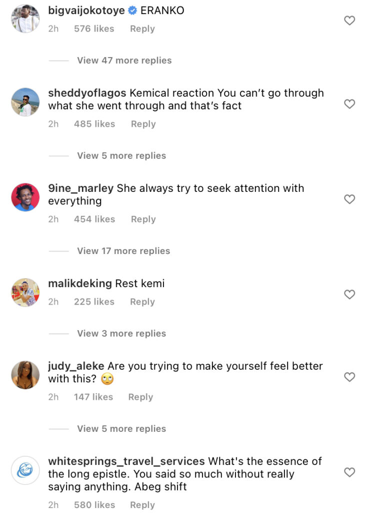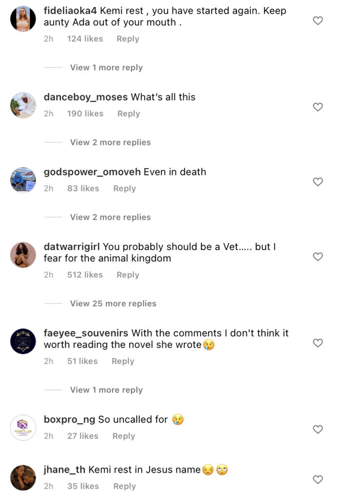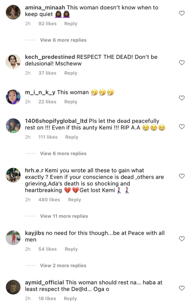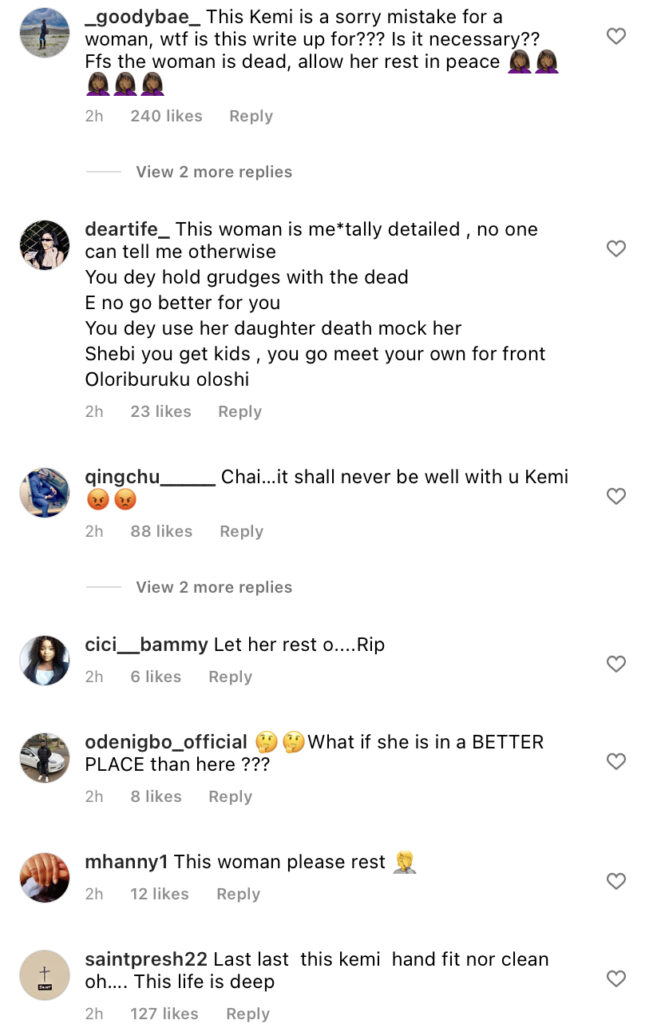 Kemi Olunloyo’s post has generated a lot of negative reactions and has been termed unnecessary by netizens who claim she should let the dead rest and not badmouth her. See some reactions and post below: