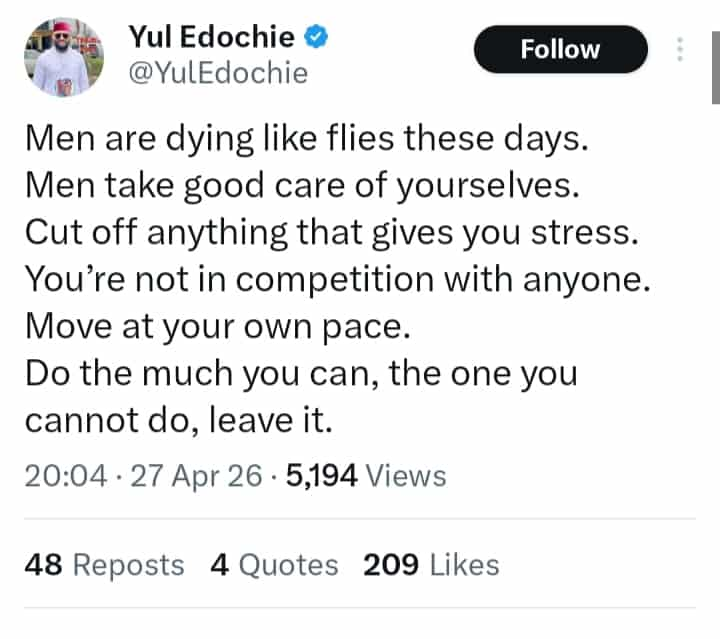 Nollywood actor Yul Edochie has shared a message directed at men, expressing concern over what he described as a rising number of premature deaths among males.