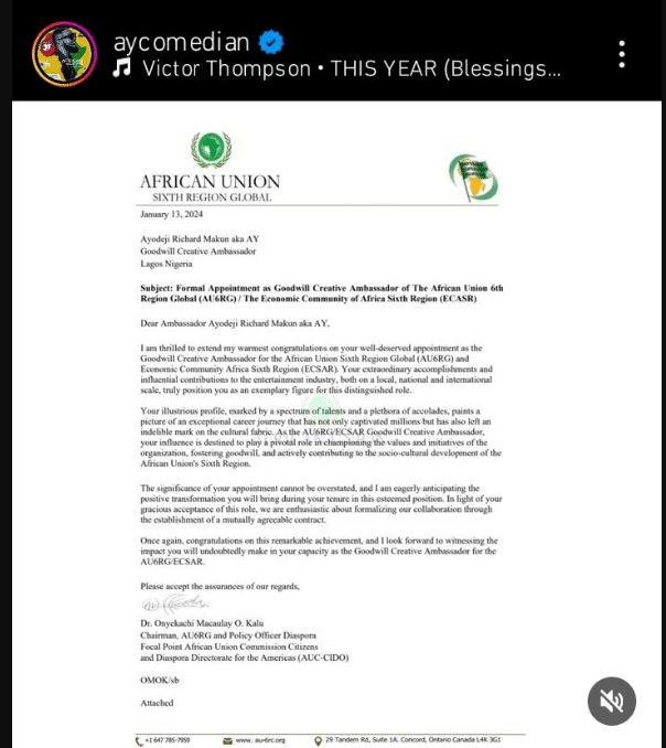 - Ayo Makun has been appointed as Creative Goodwill Ambassador for the African Union Sixth Region Global and Economic Community Africa Sixth Region, aiming to promote creative expression and engage African youth globally.