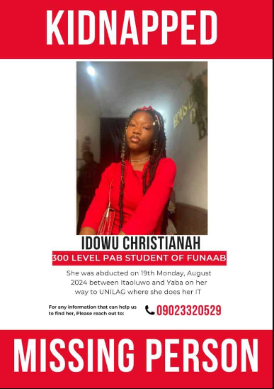 - Idowu Christianah disappeared on August 19, 2024, after her abductors used her WhatsApp account to contact her parents, send photos of her in captivity, and demand ₦1.5 million in ransom.