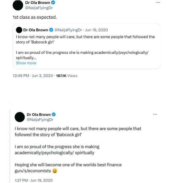 Dr. Ola Brown, a user on X platform, shared this news and highlighted the student’s resilience and determination to succeed despite the challenges she faced.