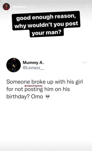 Reacting to the news, Elsie Okpocha seconded the notion that the man’s reason to break up is valid because “why won’t you post your man?” She shared on her Instastories