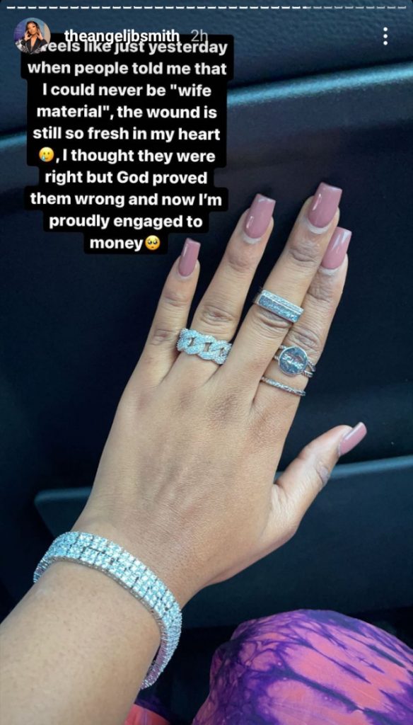 I thought they were right but God proved them wrong and now I’m proudly engaged to money.”