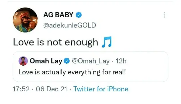 Initially, another popular Nigerian artiste, Omah Lay, stated that love is everything. This post from Omah Lay generated lots of mixed reactions, and this was when Adekunle Gold stated that love is not enough.