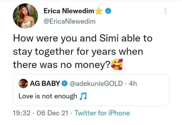 Reality TV star cum brand influencer Erica Ngozi Nlewedim, has taken to her page on Twitter to querry popular Nigerian artiste, Adekunle Gold, after he stated his opinion about love, which Erica felt contradicted what he has been through with his wife, Simi.