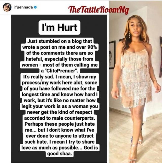 Ifu Ennada shared her pain in a post after going through comments on a blog and realized that almost everyone hates her and are even referring to her as a ‘Clitopreneur’ even though she has shared her hard work and growth on the gram.