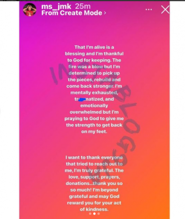 According to the person who shared the sad news with us, JMK herself is fine but unfortunately, her things have been burnt and that is really heartbreaking but we thank God she is doing well even though she might not be okay emotionally.
